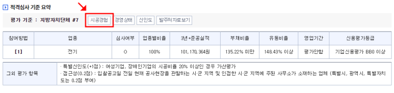 ① 공고 상세 페이지 내에서 적격심사 기준 요약 부분이 있다면 시공경험 버튼을 눌러 산식을 확인해 주세요!