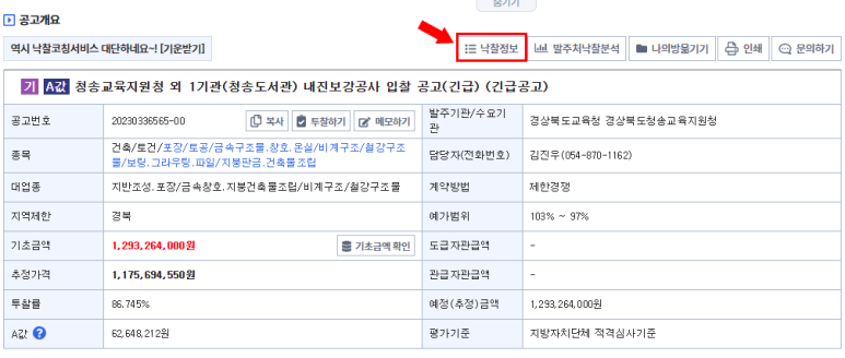 개찰 후엔 낙찰정보를 클릭하시면 예정가격 등을 간편하게 확인해보실 수 있습니다😄
