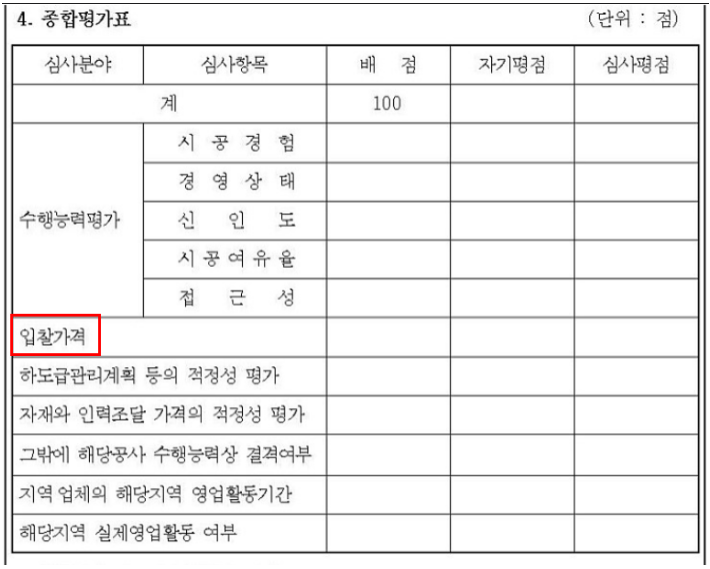 종합평가표를 보시면 입찰가격 점수를 작성하는 칸이 있습니다!