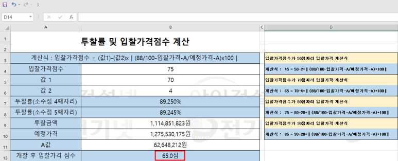 투찰률 및 입찰가격점수 자동계산 엑셀파일(A값 적용 계산식)