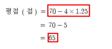 수학 공식에 따라 빼기보다 곱하기를 먼저 해줘야겠죠? 값을 모두 계산하여 최종평점은 65가 나오게 됩니다!